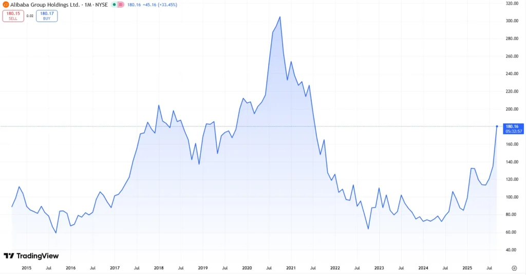 Cena akcií Alibaba prošla od svého vstupu na burzu výraznými pohyby. Po rekordním IPO na NYSE v roce 2014 akcie zaznamenaly rychlý růst, následně však čelily několika vlnám korekcí. Nejvýraznější pokles přišel v letech 2020–2021, kdy regulatorní zásahy čínských úřadů a nejistota kolem technologického sektoru srazily cenu o desítky procent. V dalších letech se začala objevovat stabilizace, podporovaná investicemi do cloudu a umělé inteligence.