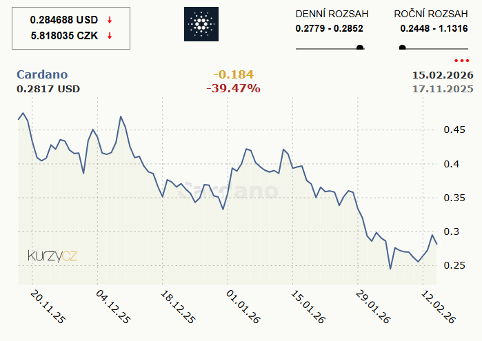 Aktuálně (k 16. únoru 2026) je cena ADA 5,85 Kč ($0,28).