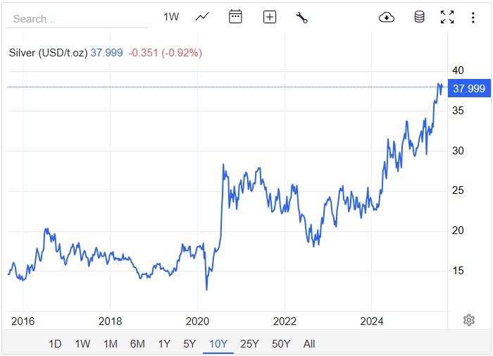 V posledních letech cena výrazně kolísala. Níže uvedený graf ceny stříbra ukazuje vývoj za posledních 10 let, kde jsou patrné výkyvy související s ekonomickými cykly, krizemi i technologickým pokrokem.